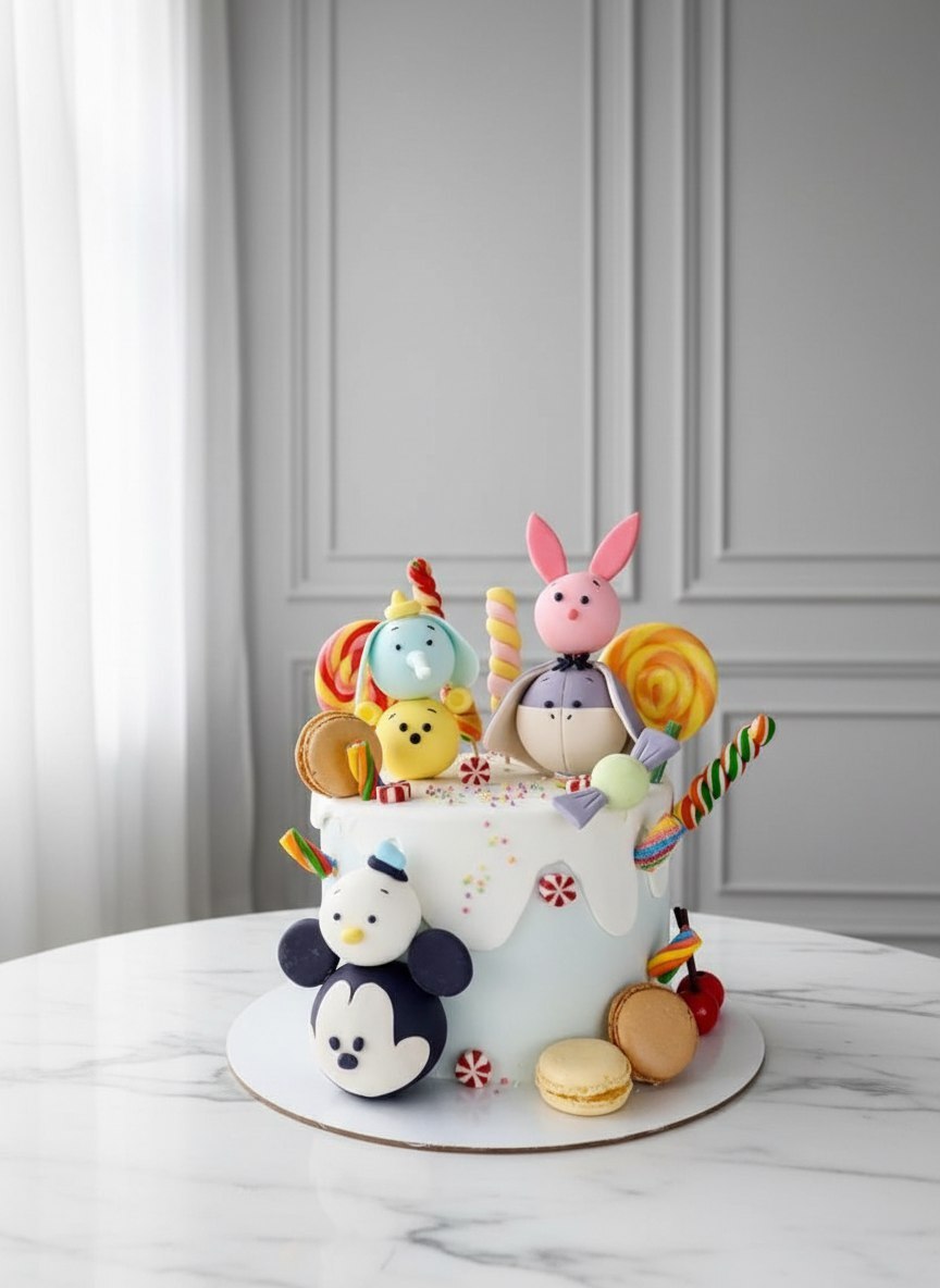 В декоре используется белый шоколад, безе на палочке, мастика, леденцы